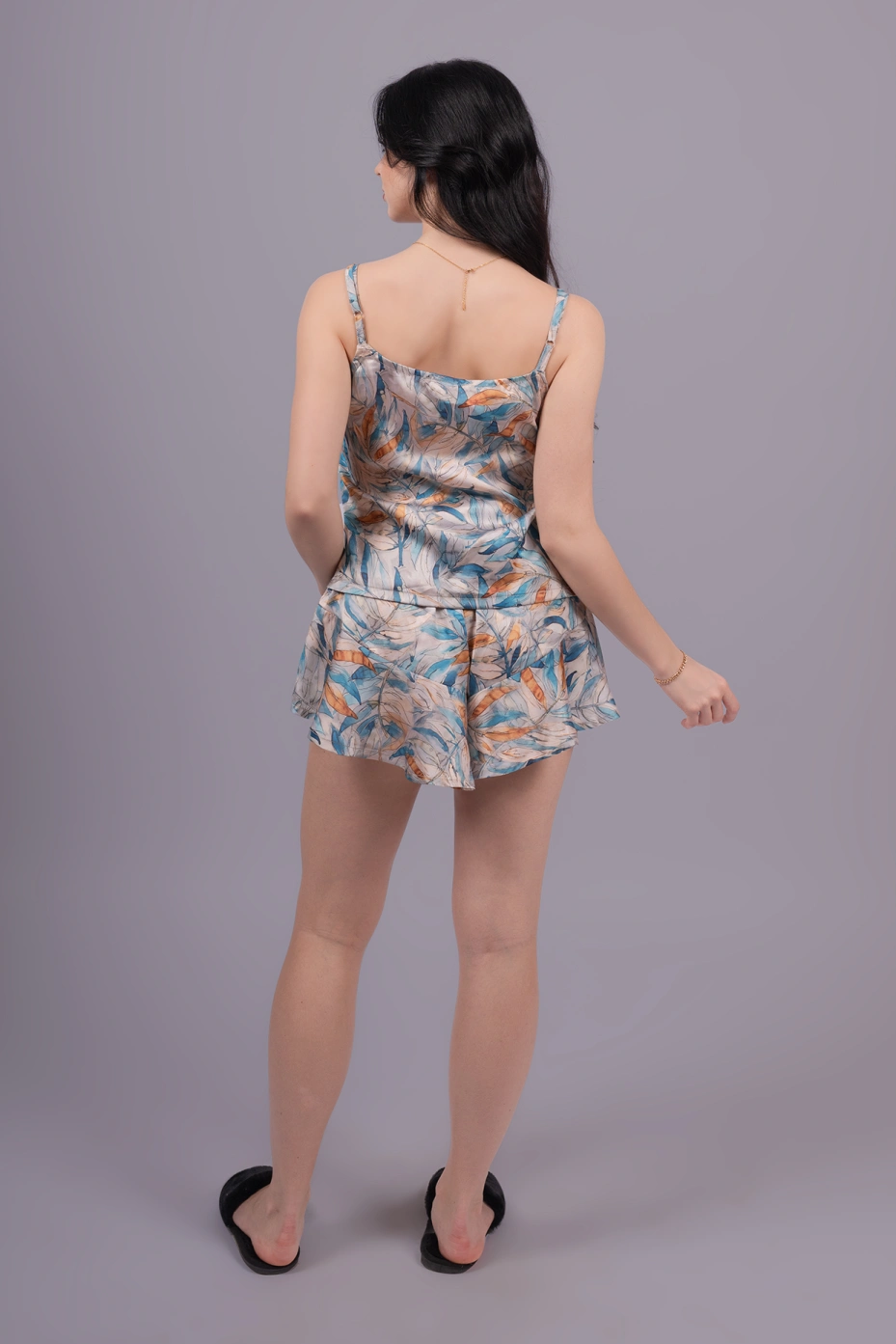 Enjoy staycation by the beach by slipping into our tropical-printed loungewear set. The cami top features a wide v-neck with buttons and strap sleeves. The pleated shorts feature a relaxed fit and flared hemline. Indulge in this matching top and shorts lounge set made from a soft and lustrous satin fabric that offers an extra reason to relax in bed.