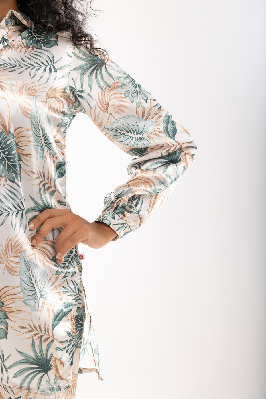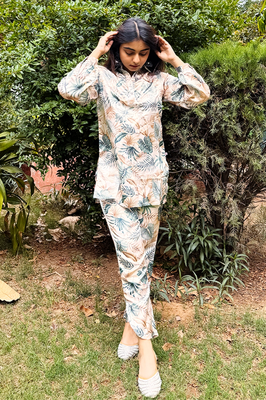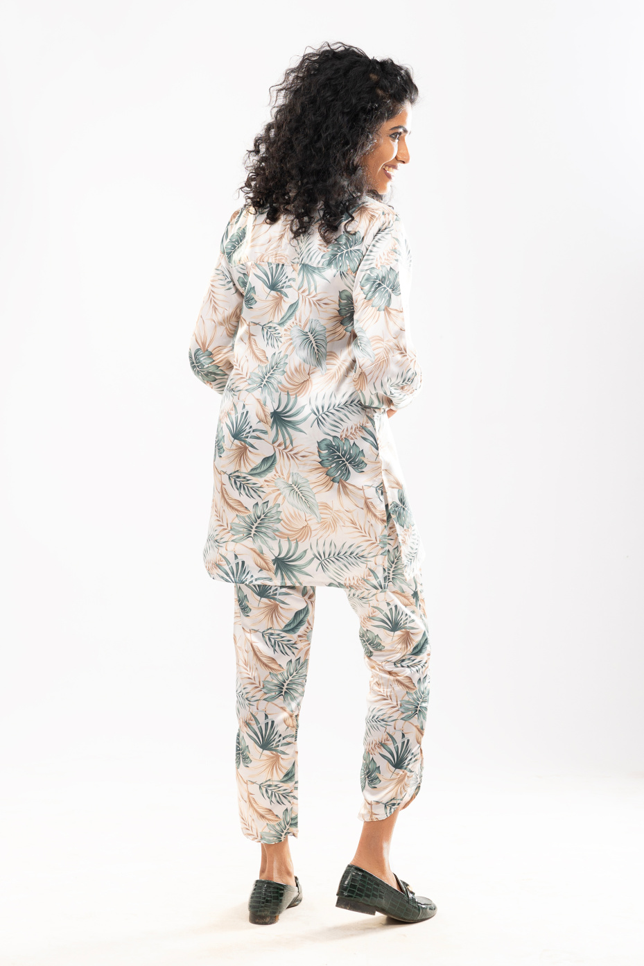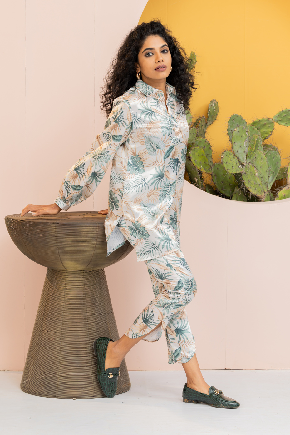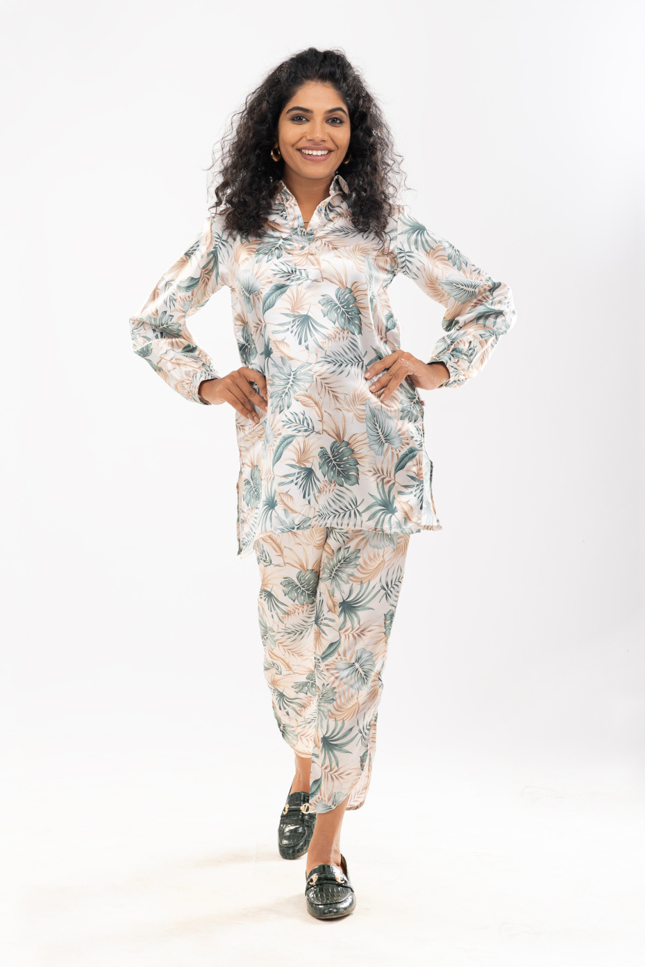 This tropical print co-ord comes with a set of full sleeves and matching trousers that give a stylish gaze. It is made up of lightweight fabric (Ultra satin) adds a touch of fun and classic and can be worn for gatherings, parties, and vacations.
