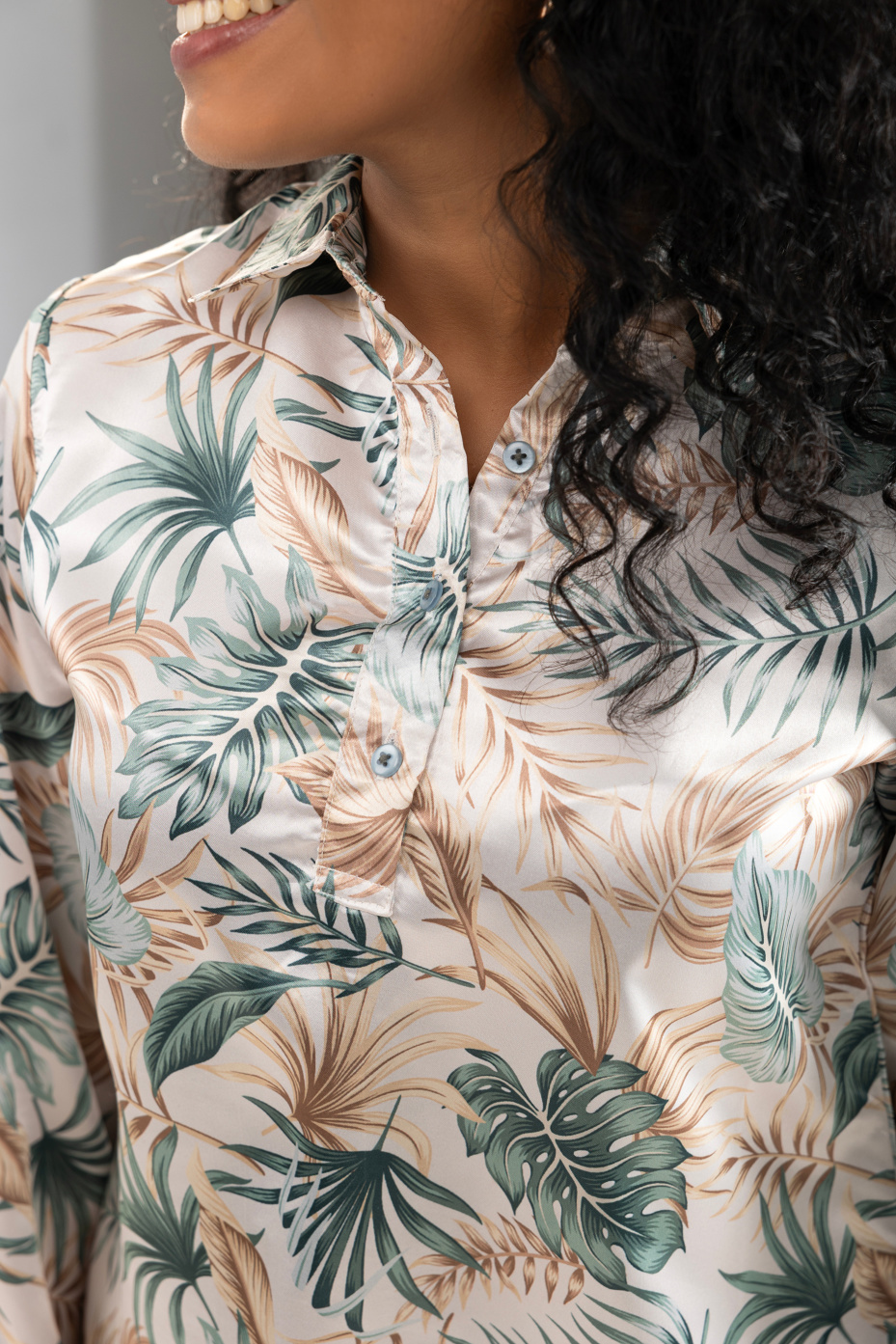 White Ultra Satin Collar Neck Tropical Print Coord Set