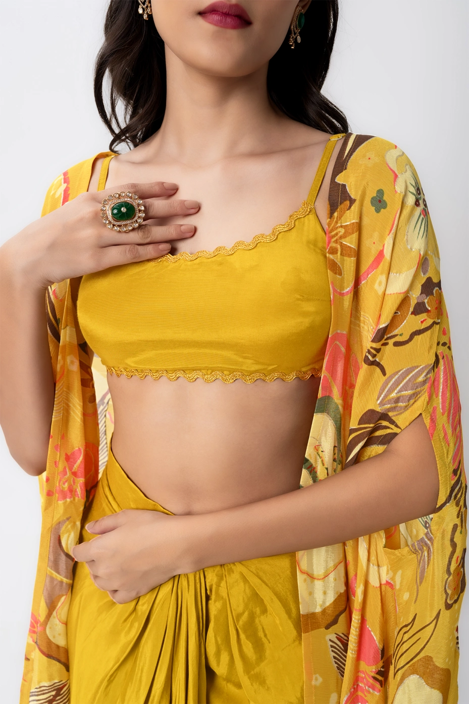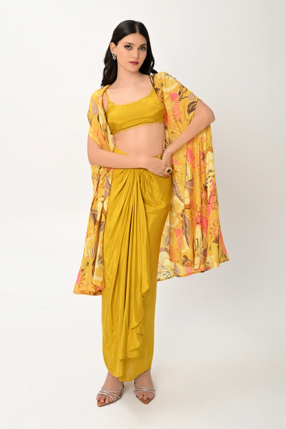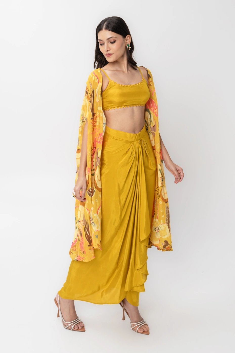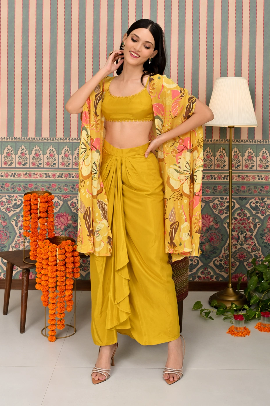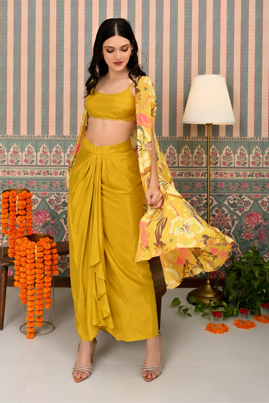 Yellow 3 Piece Coord Set With Shrug Crop Top & Dhoti Skirt