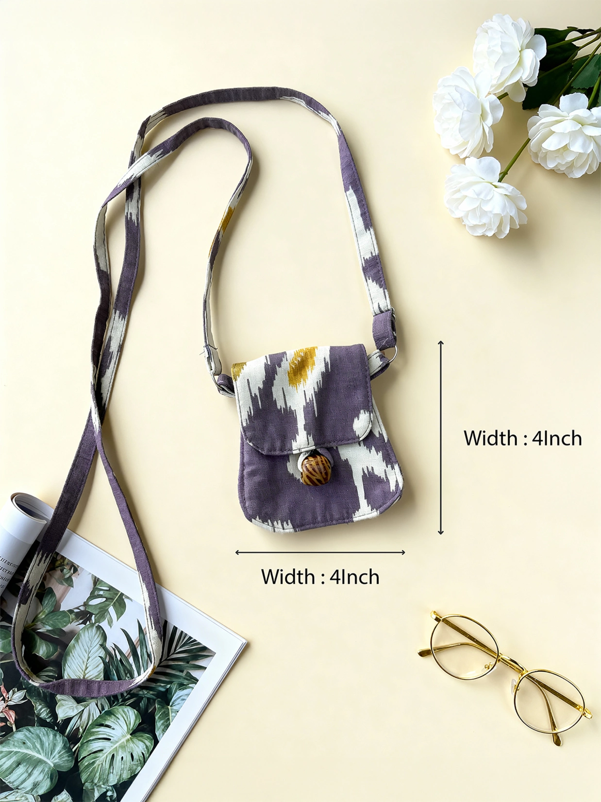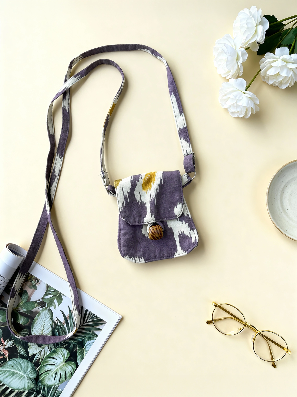 Do you prefer to create a desi vibe in your look? Then this yellow Ikat-printed mini sling bag is your go-to. It features wooden beads, a snap button, and an adjustable sling strap. Elevate your casual style with this uber-stylish bag from Zlaata.