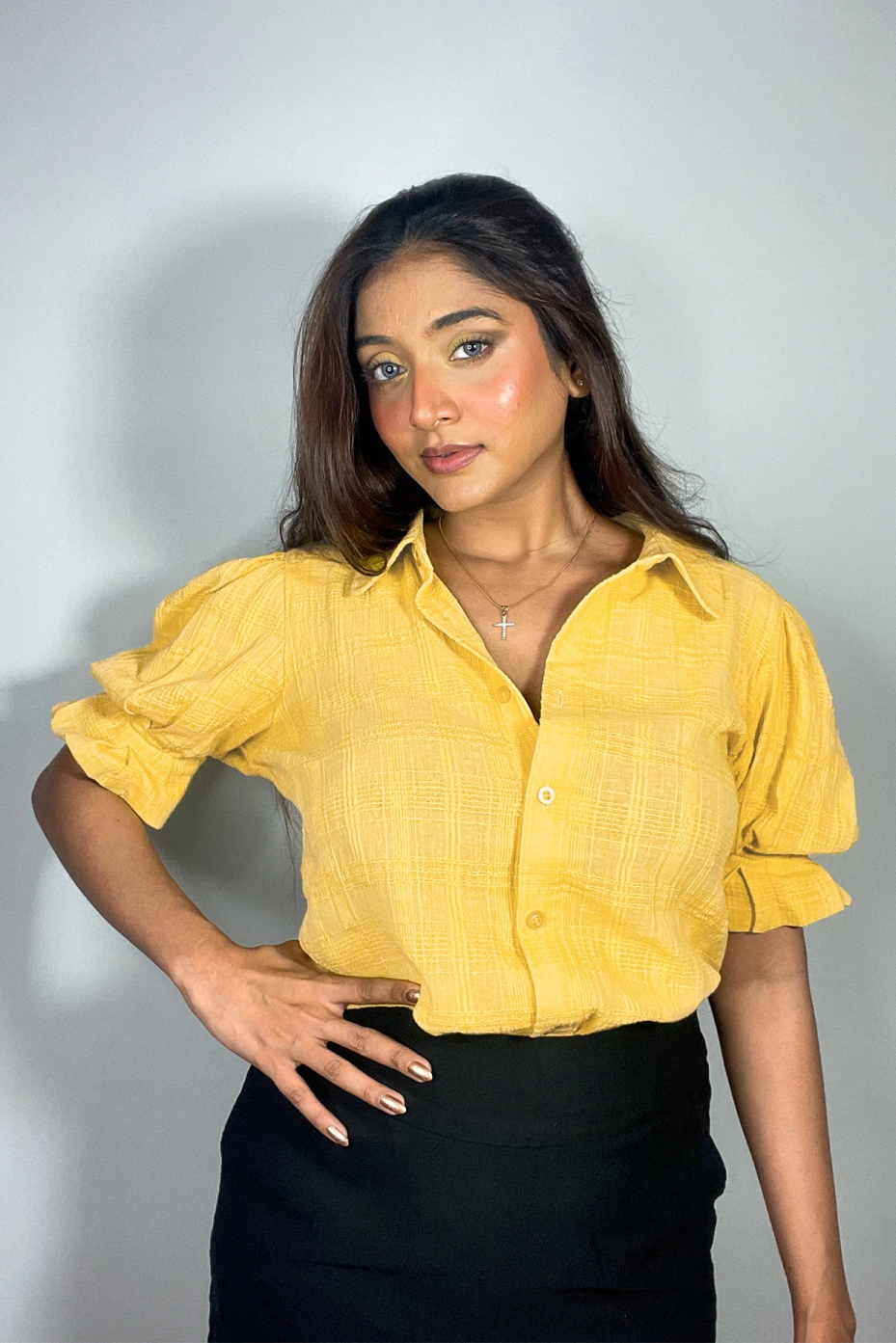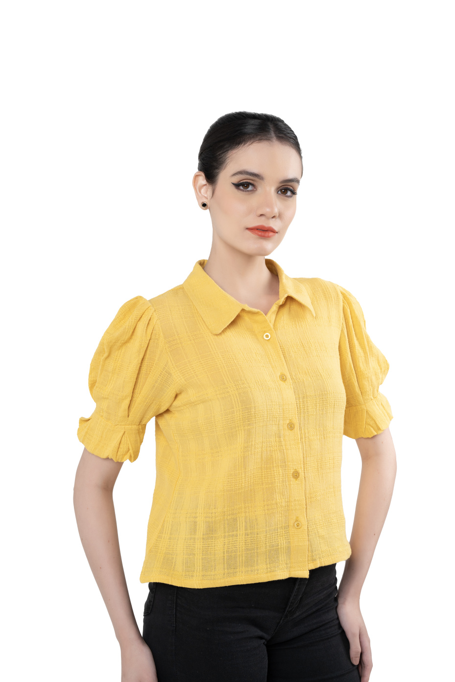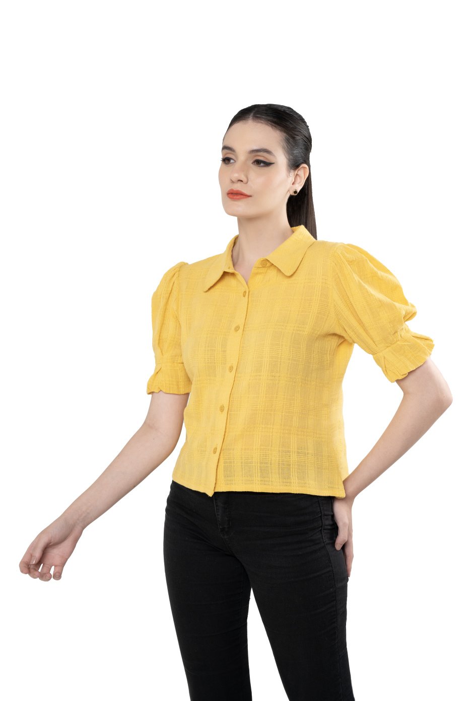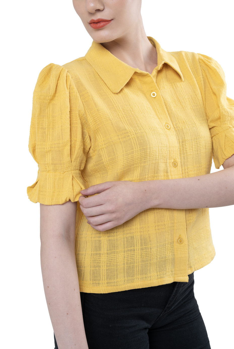 Stylish and comfortable, this puff-sleeve shirt is ideal for a hectic work schedule. It features a checked texture, a regular collar, puff sleeves, and a regular fit. The fabric used is Cotton, which is soft and comfortable. Style it by pairing black formal pants with block heels for a sharp look.